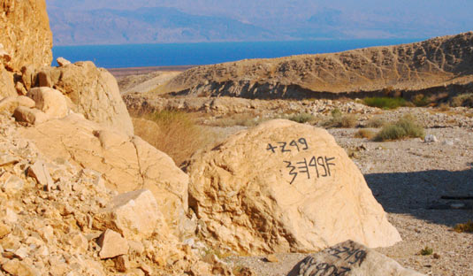 Now the next task is to find out, who wrote this. Who is strolling with a bucked of paint through the cliffs between the dead sea and the judean desert to paint graffiti in ancient stylized script on rocks? If you have a hint, please feel free to contact me. Update: The first hints by Chanen suggest that it could be much older than I thought, about 20 years old. Also, it could have been part of some scavenger hunt.